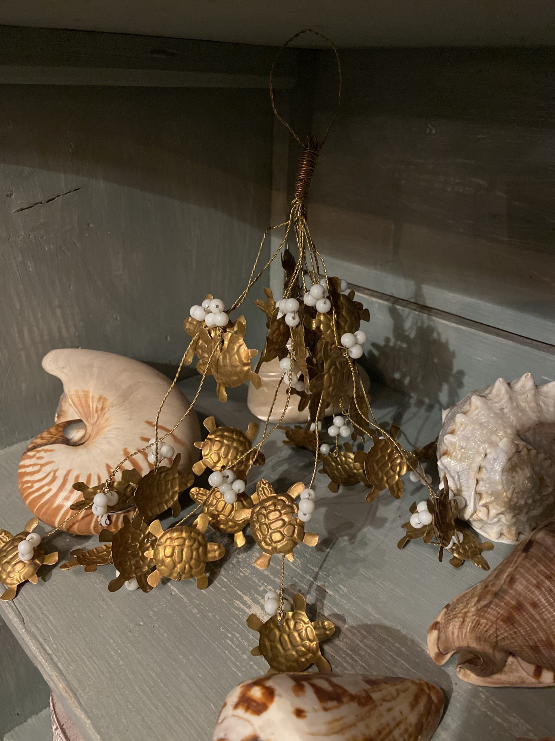 Suspension ou pompon de fils de laiton avec mini tortues et perles blanches