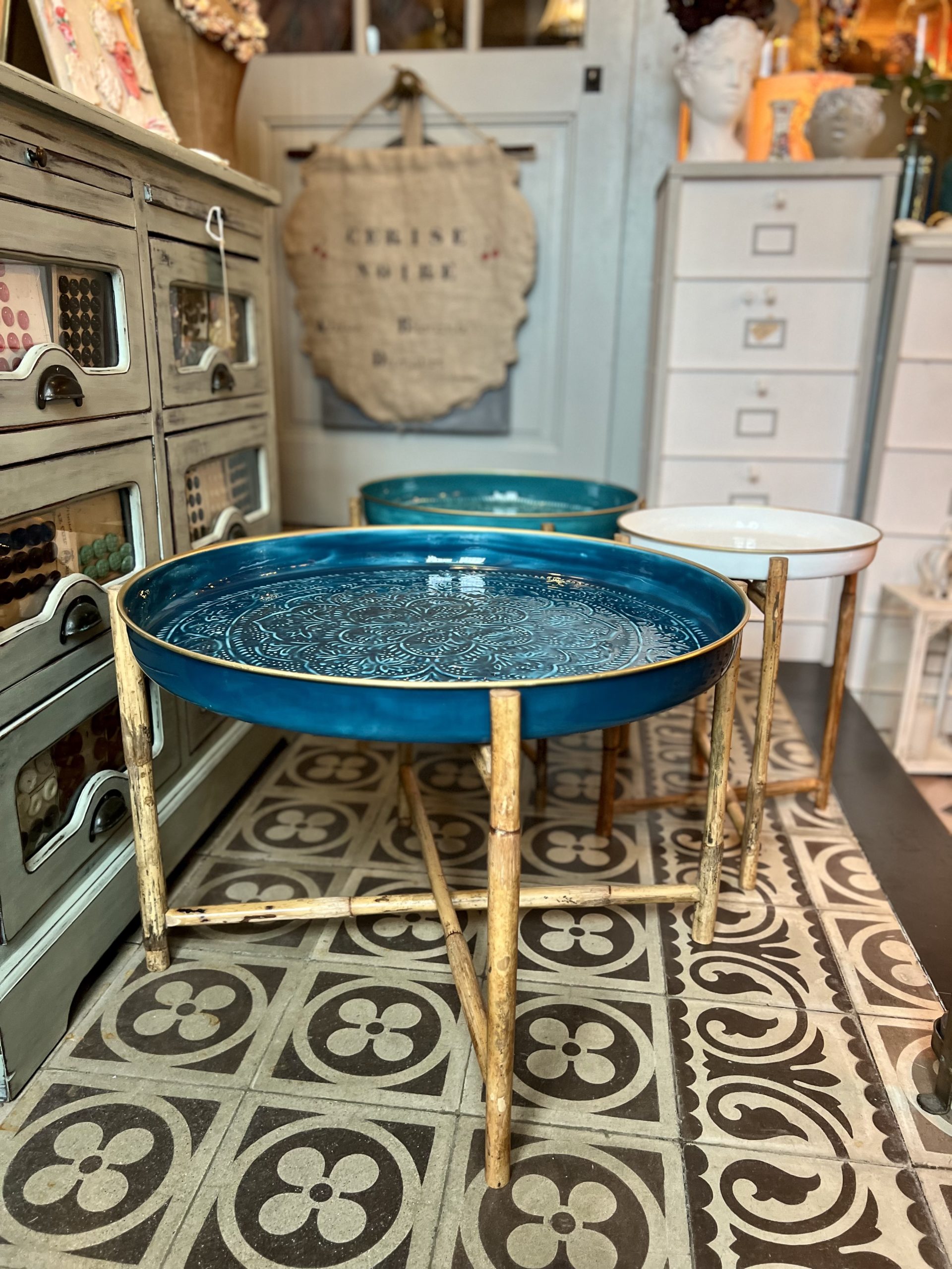 Grand plateau berbère en métal émaillé et son trépied en bambou